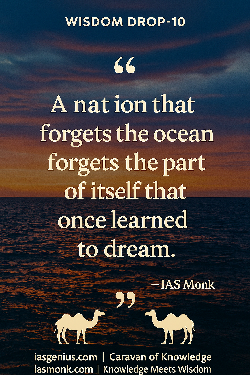 🟦 WISDOM DROP-10 “A nation that forgets the ocean forgets the part of itself that once learned to dream.” — IAS Monk ✨ WD-10 — Thought…